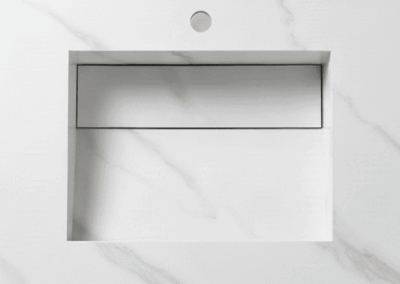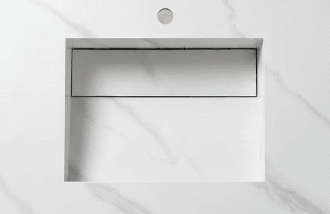 Lavabo integrado rectangular, fondo muy plano y recogida de agua en tapeta removible.