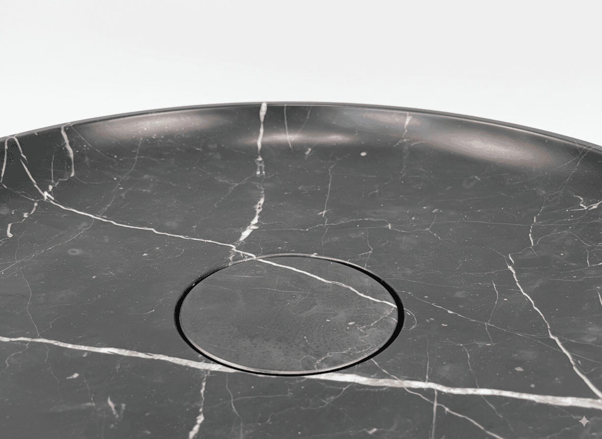 Lavabo circular de piedra natural, canto superior muy fino y fondo curvo muy suave, con tapa de desagüe del mismo color.