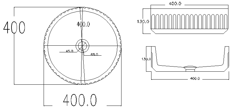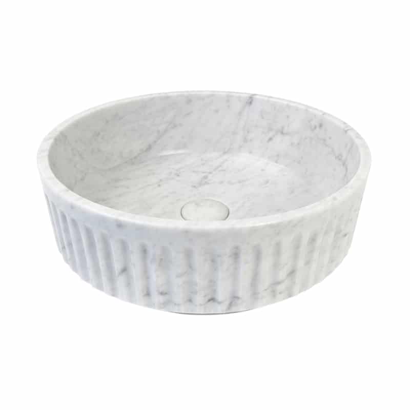 Lavabo circular de piedra natural, paredes con acanaladuras esculpidas, fondo muy plano con tapa de válvula “click” del mismo color.