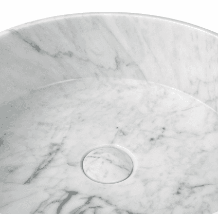 Lavabo circular de piedra natural, canto superior muy fino, paredes rectas y fondo muy plano con tapa de válvula “click” del mismo color.