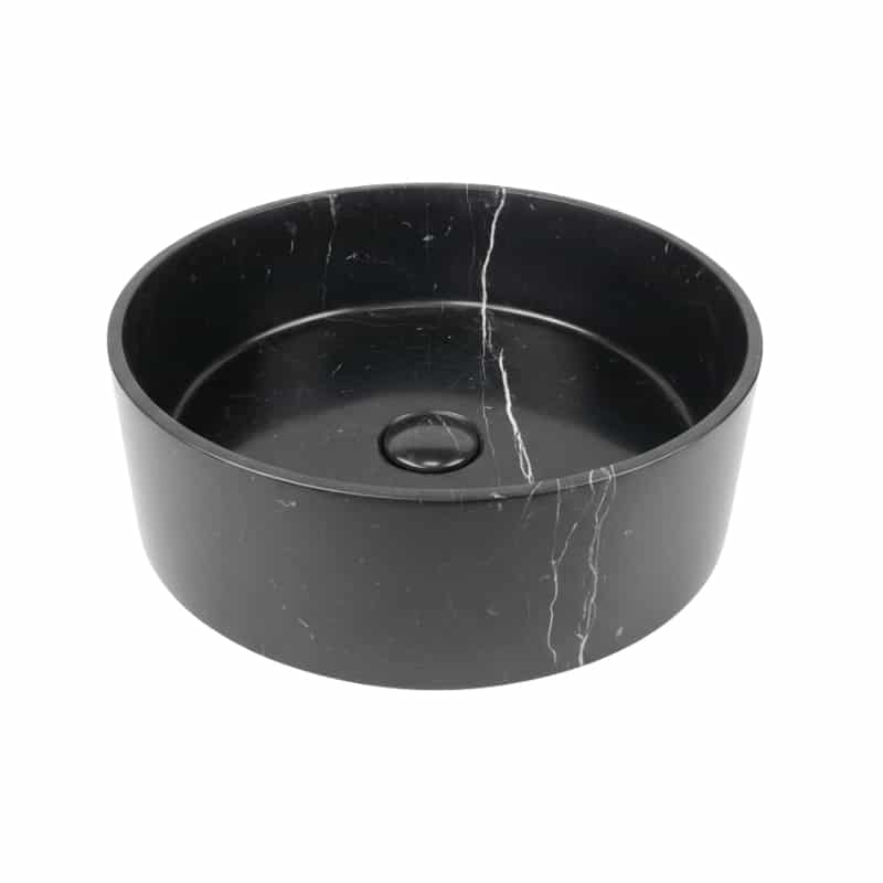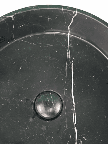 Lavabo circular de piedra natural, canto superior muy fino, paredes rectas y fondo muy plano con tapa de válvula “click” del mismo color.